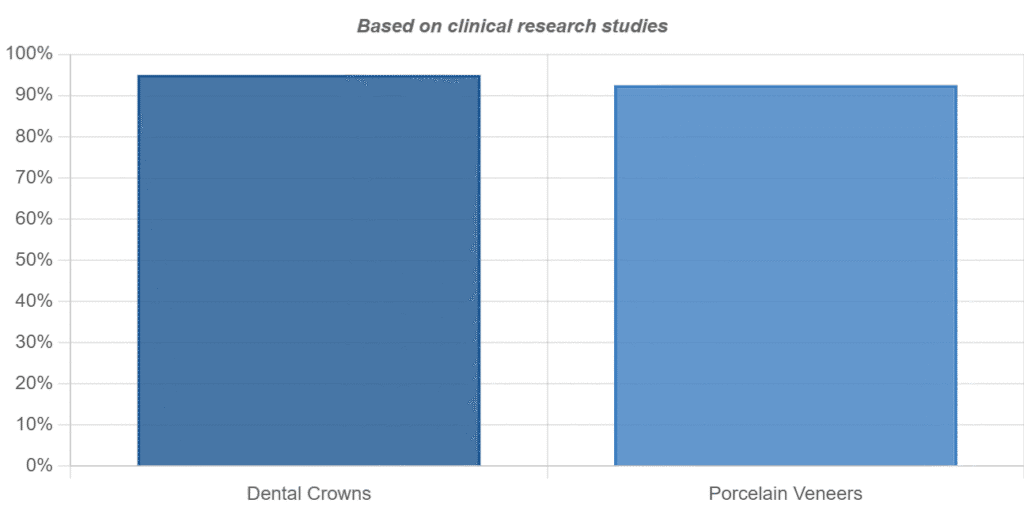Veneers also perform very well. Research indicates that 90 to 95 percent of veneers remain in excellent condition after 10 years of use. The key difference is that veneers work best when bonded to healthy tooth enamel. When placed correctly by an experienced dentist, veneers can last 20 years or longer.